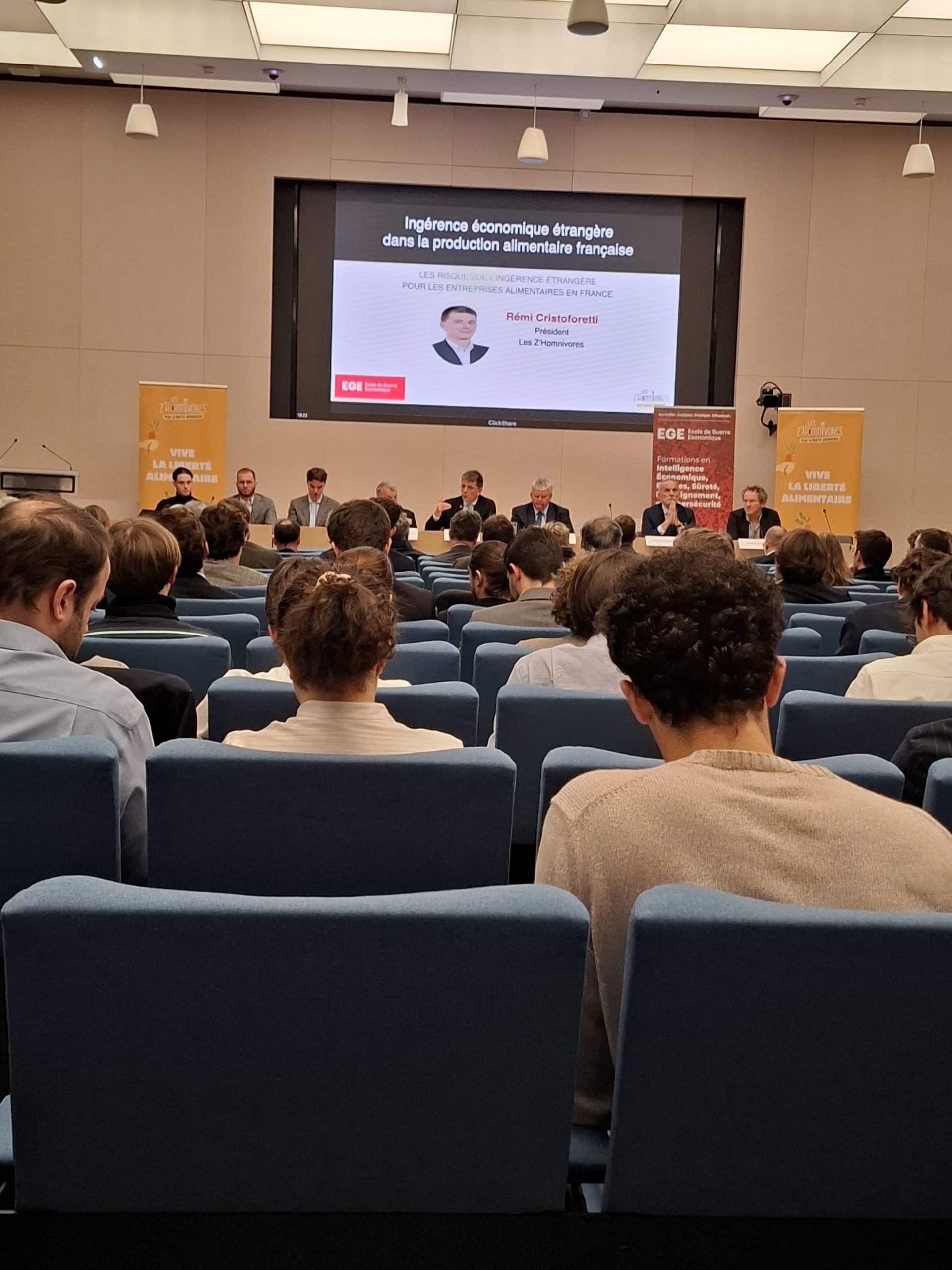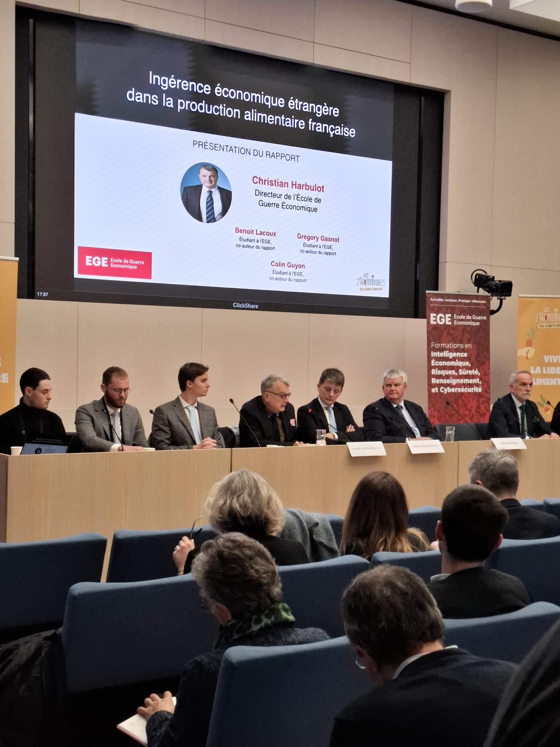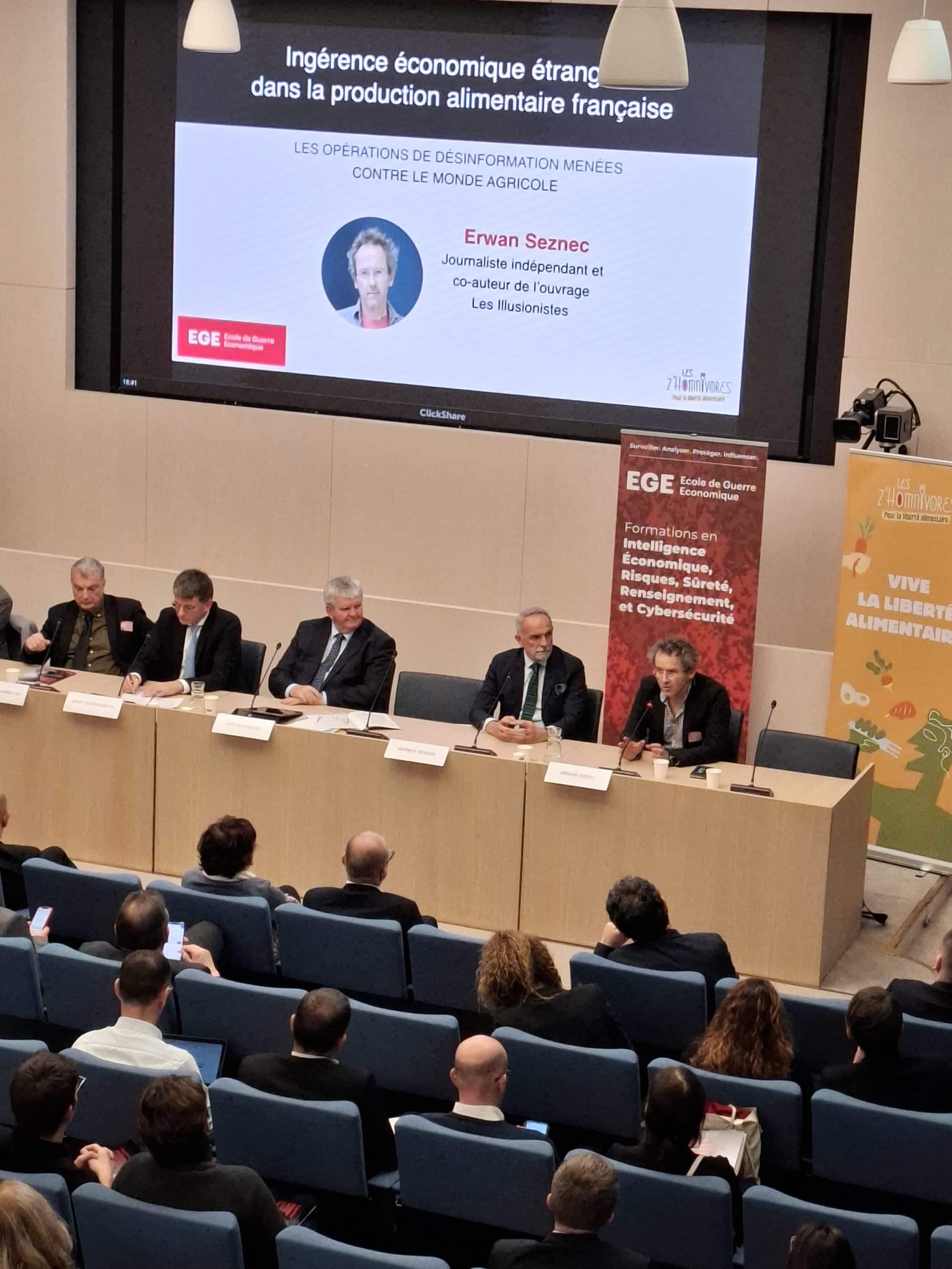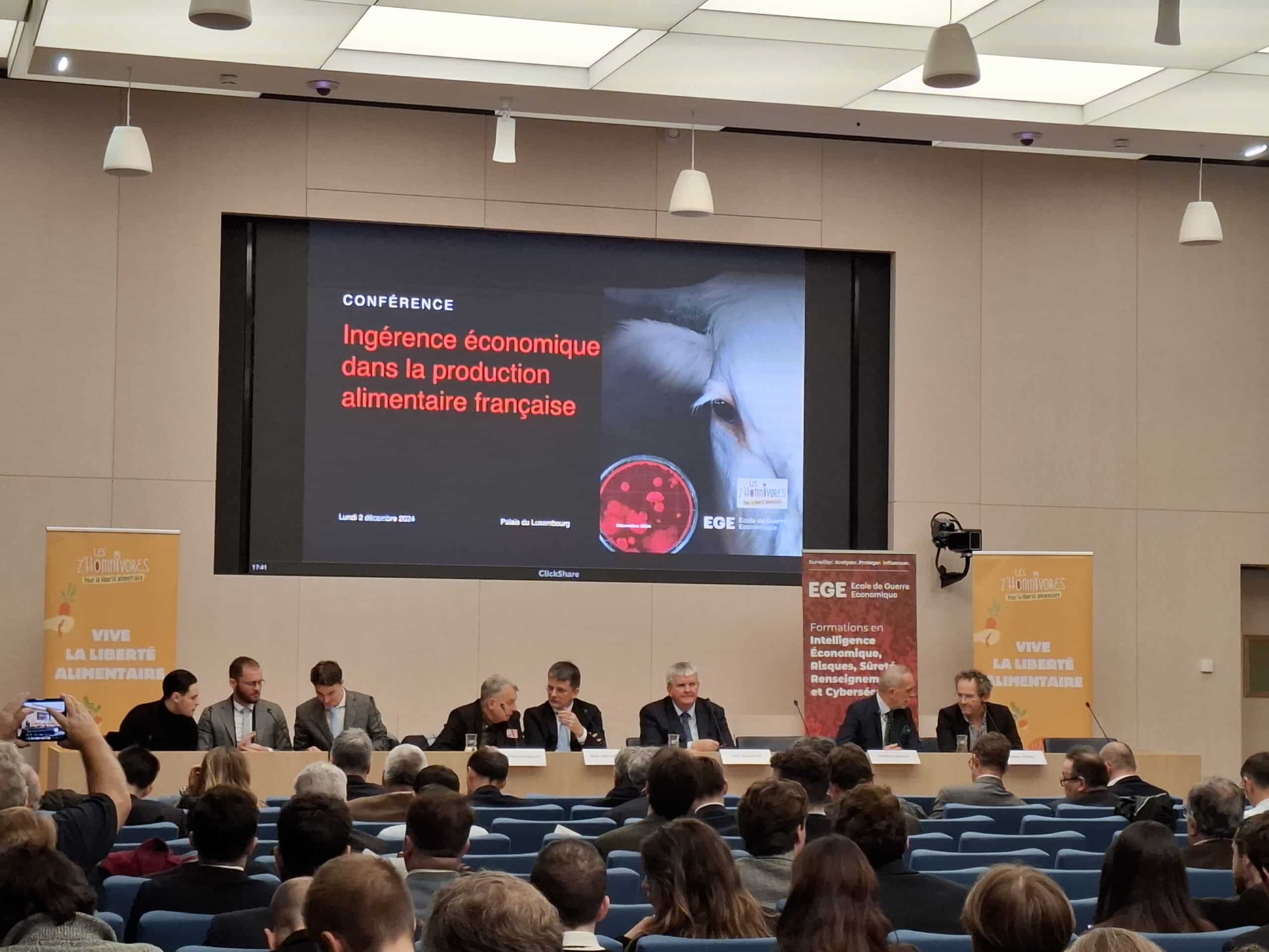 Le 2 décembre dernier, plus de 170 invités, parlementaires, acteurs de la filière alimentaire et de l’intelligence économique se sont retrouvés au Sénat pour la présentation du rapport « Ingérence étrangère dans la production alimentaire française » réalisé par l’École de Guerre Économique (EGE). Parrainée par le Sénateur Yves Bleuven, cette conférence, coorganisée par l’EGE et le think tank Les Z’Homnivores, était l’occasion de révéler les réseaux de financements américains vers des organisations animalistes s’attaquant aux entreprises alimentaires. L’objectif est de mener des campagnes de déstabilisation contre la filière agricole française. Deux grands témoins Patrick Devaux* et Erwan Seznec** étaient présents pour apporter une hauteur de vue sur les ingérences étrangères et sur les opérations de désinformations menées contre le monde agricole.